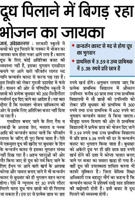 जासं, अंबेडकरनगर : सरकारी स्कूलों में बच्चों को दूध पिलाने के चक्कर में भोजन का जायका कम होता नजर आने लगा है। कारण दूध के लिए कोई अतिरिक्त बजट की व्यवस्था नहीं है, इसका भुगतान एमडीएम बनाने पर आने वाले परिवर्तन लागत मद यानि कन्वर्जन कास्ट से करना पड़ रहा है। इस स्थिति को लेकर गुरुजी उहापोह में फंसे हैं। शासन की ओर से परिषदीय स्कूलों में छात्रों को प्रत्येक बुधवार को 200 मिलीलीटर गर्मागर्म दूध दिए जाने का आदेश है। यह बात दीगर है कि मध्याह्न भोजन प्राधिकरण की ओर से इसके लिए अतिरिक्त बजट नहीं दिया जा रहा है।