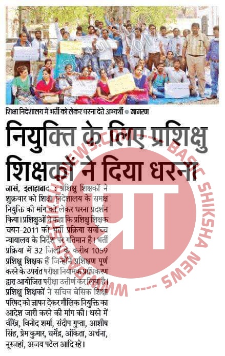जागरणजासं, इलाहाबाद : प्रशिक्षु शिक्षकों ने शुक्रवार को शिक्षा निदेशालय के समक्ष नियुक्ति की मांग को लेकर धरना प्रदर्शन किया। प्रशिक्षुओं ने कहा कि प्रशिक्षु शिक्षक चयन-2011 की भर्ती प्रक्रिया सर्वोच्च न्यायालय के निर्देश पर गतिमान है। भर्ती प्रक्रिया में 32 जिलों के करीब 1059 प्रशिक्षु शिक्षक हैं जिन्होंने प्रशिक्षण पूर्ण करने के उपरांत परीक्षा नियामक प्राधिकरण द्वारा आयोजित परीक्षा उत्तीर्ण कर लिया है। प्रशिक्षु शिक्षकों ने सचिव बेसिक शिक्षा परिषद को ज्ञापन देकर मौलिक नियुक्ति का आदेश जारी करने की मांग की। धरने में वीरेंद्र, विनोद शर्मा, संदीप गुप्ता, आशीष सिंह, प्रेम कुमार, धर्मेद्र, अंकिता, अर्चना, नूरजहां, अजय पटेल आदि रहे।