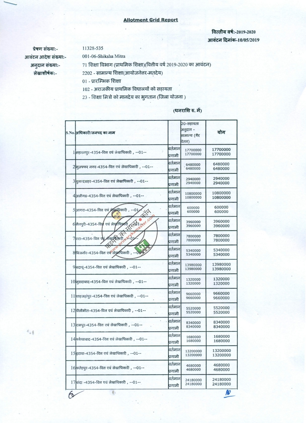SHIKSHAMITRA, GARNT, MANDEYA : वित्तीय वर्ष 2019-20 में शिक्षामित्रों के मानदेय भुगतान हेतु धनराशि की प्रथम किश्त जारी, आदेश व जनपदवार आवंटन देखें