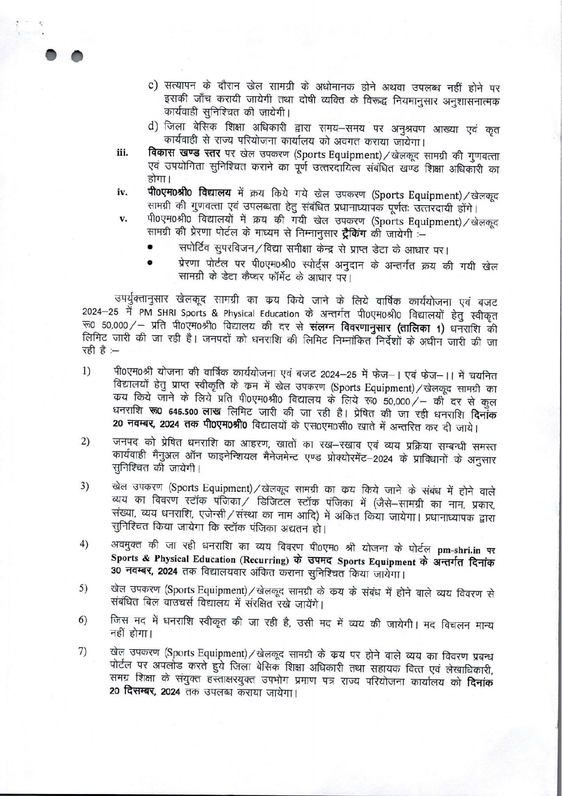 पीएम श्री योजनान्तर्गत (2024-25) खेल उपकरण / खेलकूद सामग्री कय किये जाने हेतु दिशा-निर्देश एवं धनराशि प्रेषण विषयक आदेश जारी